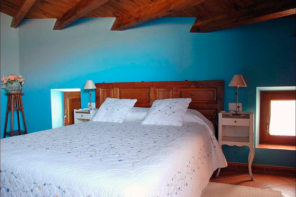 Habitación abuhardillada de color azul y cama de 1,50 m.